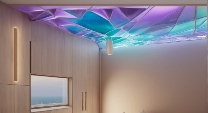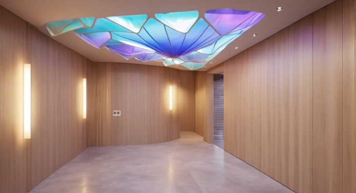 Considering the limited space we had to plan the entire installation, we chose the ceiling to carry it out. The concept was based on iridescence that stemmed out of biomimicry.